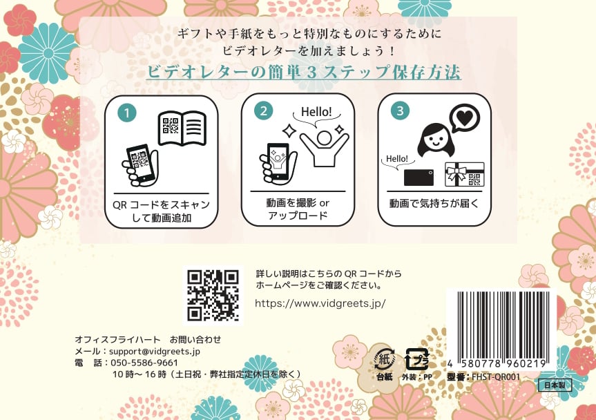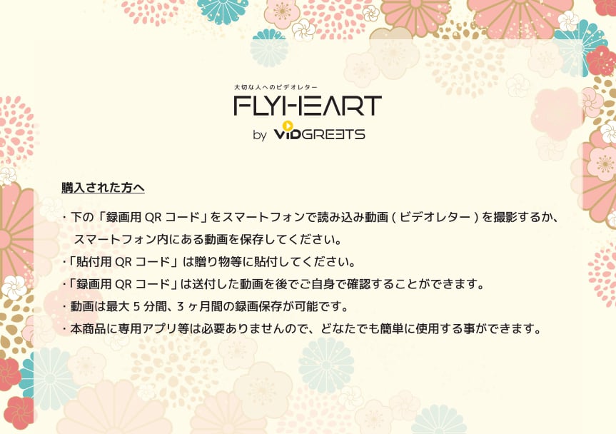 「フライハート」は手書きのメッセージと合わせてQRコードを使って「動画メッセージ」も送れるサービスです。ご自身だけで簡単に「動画メッセージ」を渡せる新しいカタチのサービスになっています。